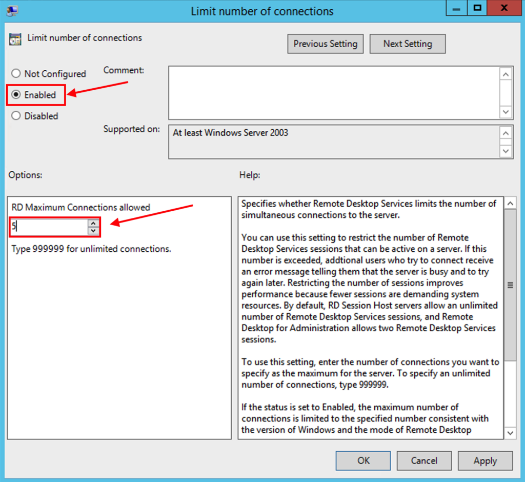 - Tại mục “RD Maximum Connections allowed“, nhập số lượng kết nối tối đa mà bạn muốn cho phép. Ví dụ nhập 5 nếu muốn tối đa chỉ 5 người truy cập cùng lúc.